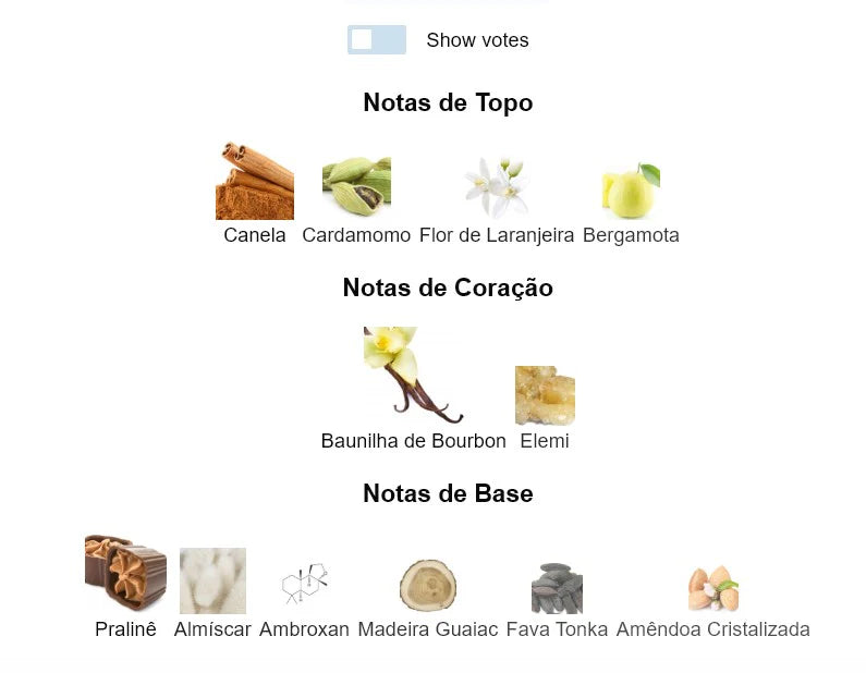 Notas de fundo: Pralinê, almíscar, ambroxan, madeira, fava tonka e amêndoa doce
